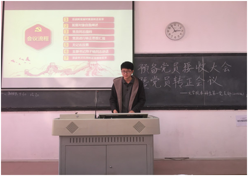 朱旺波介绍会议流程,宣读支部拟发展对象及转正名单。预备党员接收大会由发展对象自我阐述开始。在党员向发展对象提问环节,当问到入党之后要做些什么时,发展对象邹思雯回答到:“严格遵守党章规定,时刻以党员标准要求自己。在遇到困难我会积极生活,用乐观的态度对待艰难险阻,积极关心国家大事和政策。”
