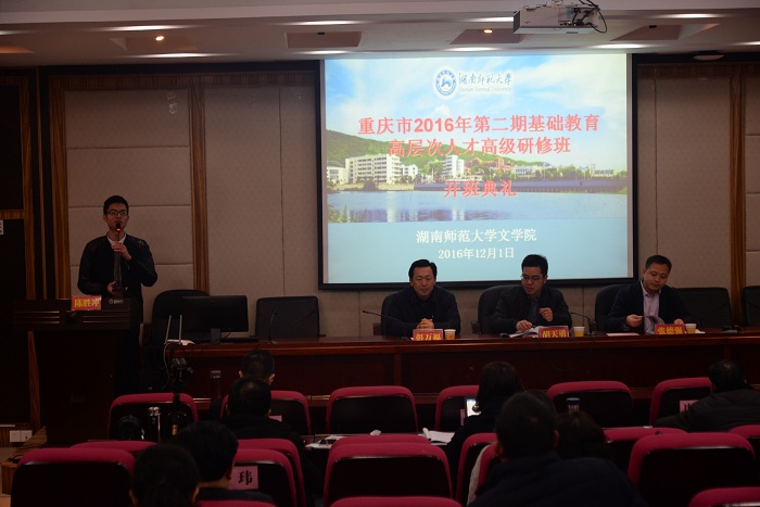 12月1日上午,由ylg060net永利娱高承办的重庆市2016年第二期基础教育高层次人才高级研修班开班典礼在216教室举行。重庆市教委胡天勇、重庆市第二师范公司老师胡术鄂、ylg060net永利娱高副经理彭万福、成教办主任张德强等出席开班典礼。开班典礼由研修班班主任陈胜冲主持。