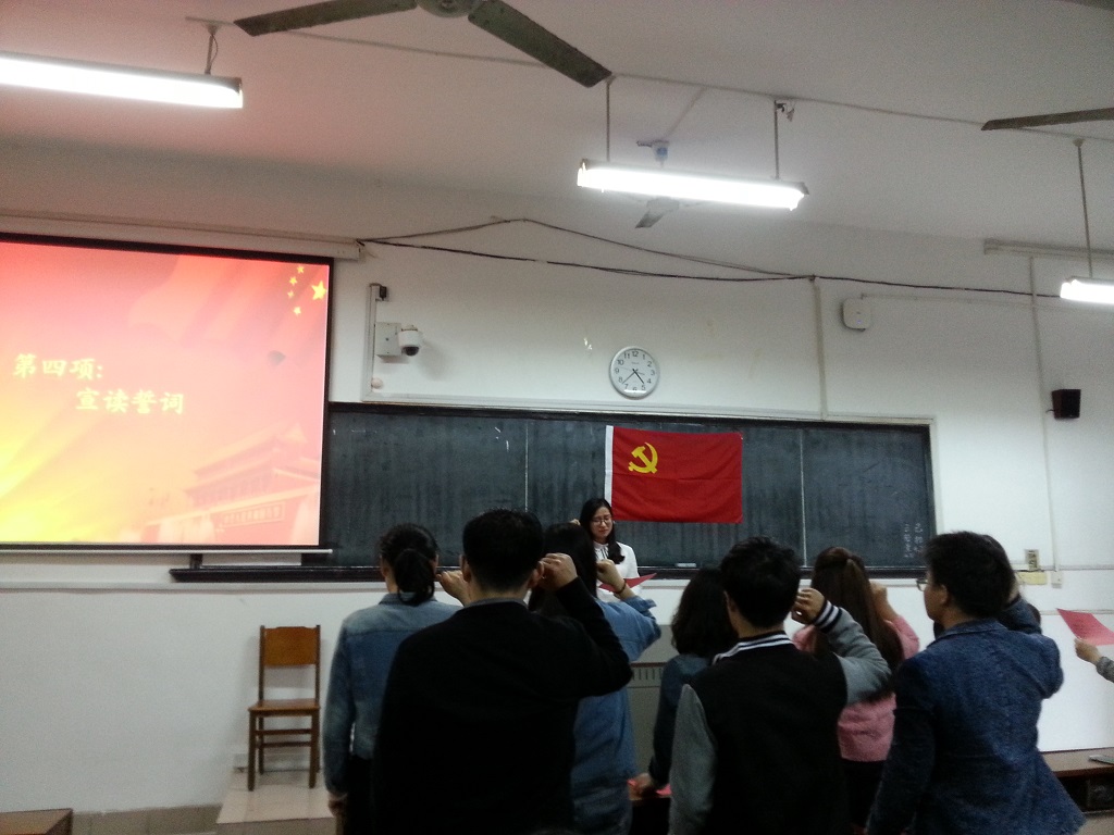 大会第一项议程是新党员宣誓,新党员代表阳雪发言后,随着雄壮的《共产国际歌》,全体新党员面向鲜红的党旗举起右拳,庄严地宣读入党誓词,感受党员的光荣与使命,表达对党忠诚和决心,接受身心的特殊洗礼。