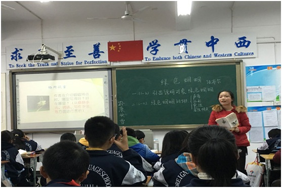 以趣味横生的谜语入课,实习队员黄琪在1504班开始讲授科普说明文《绿色蝈蝈》。她分别从作者介绍、整体感知、探讨分析以及课文小结四个部分讲授文本。最后,黄琪以让员工给蝈蝈出一个谜面作为此次课堂结尾。