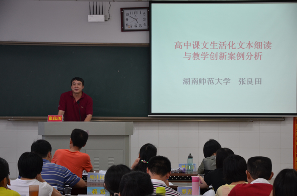 在“以文本分析为基础,以语境分析为依托,以交际分析为核心,以意图分析为旨归”的理念引导下,张良田具体讲授了如何细读文本,并进行高中语文生活化教学,联系生活,拓展创新。如何读懂、读透、读活、读化文本是该堂课的重心。
