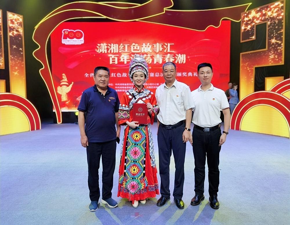 比赛现场,参赛选手们以湖湘革命先辈、开国将帅、英雄模范和在百年党史历程中具有重大影响的历史事件为基本素材,紧扣红色主题,从自身独特视角出发,讲述红色故事。公司ylg060net永利娱高硕士研究生江静雪第一位出场,以《一首湘西民歌的家国情》为题,深情讲述了湘西土家民歌《马桑树儿搭灯台》背后集思想性、故事性、教育性于一体的红色故事,生动诠释了在百年党史中中国共产党员的初心使命与家国情怀,感动了在场所有评委与观众,最终荣获全省最高奖。