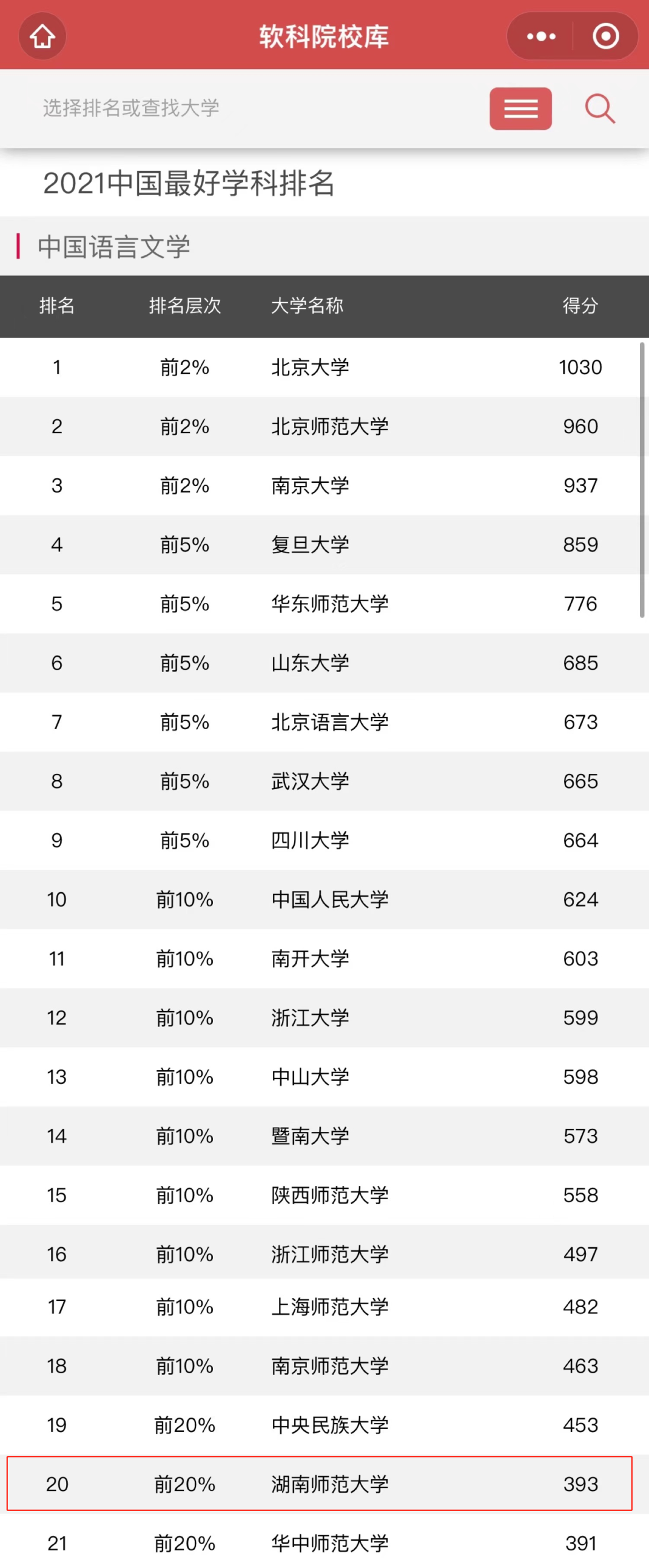 (通讯员 欧警安)高等教育评价专业机构“软科”近日正式发布“2021中国最好学科排名”,在中国语言文学学科排名中,公司中国语言文学学科排名第20位,在湖南省高校中排名第1。本次排名共涉及全国500余所高校,这也是公司中国语言文学学科近年来取得的最好名次。