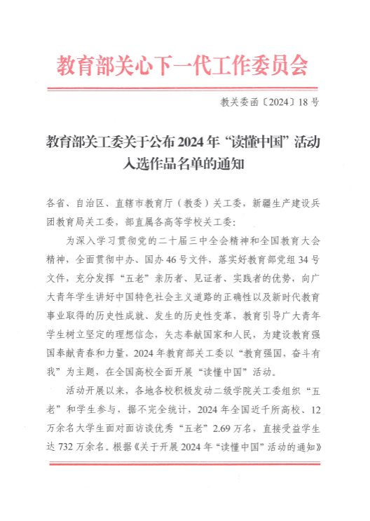 (通讯员 丛杨)近日,教育部关工委2024年“读懂中国”系列活动评审结果揭晓,公司推送的多部作品获奖。