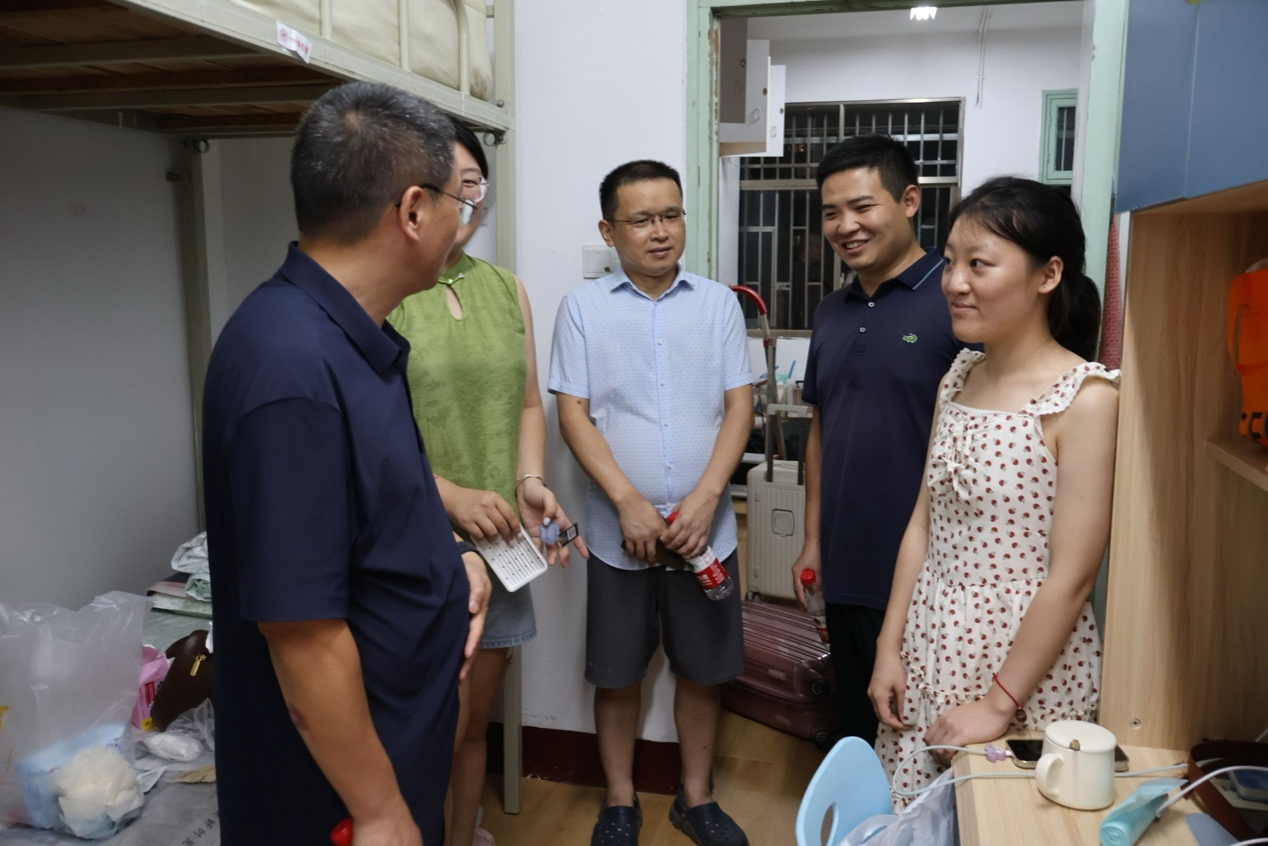 在咸嘉湖校区,院领导走访研究生寝室,了解新生入学适应状况,吕双伟逐一检查各寝室的水电设施、通风采光等情况,要求随行工作人员详细记录存在的问题,帮助新生尽快适应学习生活。公司领导针对新生提出的相关问题进行解答,嘱咐新生要提高安全意识,注意防范诈骗,妥善保管个人财物,合理规划学习与生活,保持积极心态。