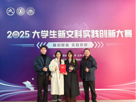(通讯员潘梦)11月28日至30日,2025年老员工新文科实践创新大赛决赛在陕西西安举行。由丛杨、刘宓蜜老师指导,潘梦、龙心怡等同学创作的项目《“数智非遗经济人”——基于数字创意的非遗朋克IP活态传承计划》获国赛金奖。