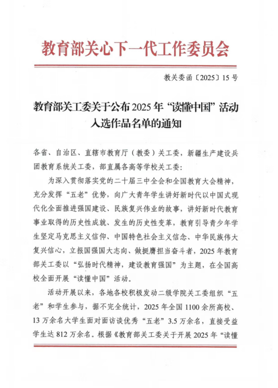 (通讯员 李静莲 谢宇熹)近日,教育部关工委2025年“读懂中国”活动入选作品名单公布,公司报送的多项作品获得表彰。