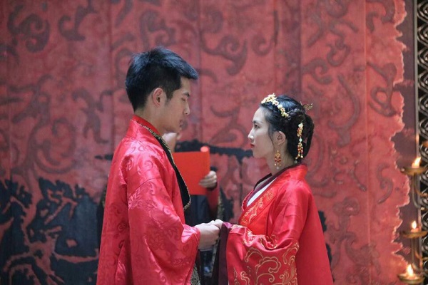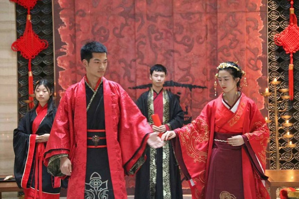 下午15点30分,汉式婚礼正式开始。在主礼官请新婿新妇入华堂后,依次举行了弃扇礼、入堂传代礼、沃盥礼、对席礼、同牢礼、合卺礼、结发礼、交拜礼、执子礼等礼仪,在新婿新妇向宾客行礼后,婚礼结束。整场婚礼在庄重喜庆的音乐中进行,同时此次婚礼的布景、道具全部以汉代形制为准,尊古而不泥古,彰显汉式特色,以此弘扬传统婚礼文化。