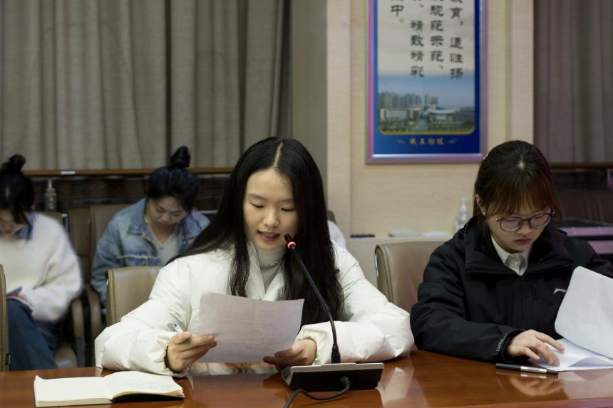 实习队长范茗萱在发言中感谢院领导及实习公司各位领导、老师的帮助,同时承诺实习队员会坚持“四有”原则,即有思想、有计划、有落实,认真对待实习工作,实现自我成长。最后,实习队副队长王佳露总结汇报本队教育实习前期准备工作。