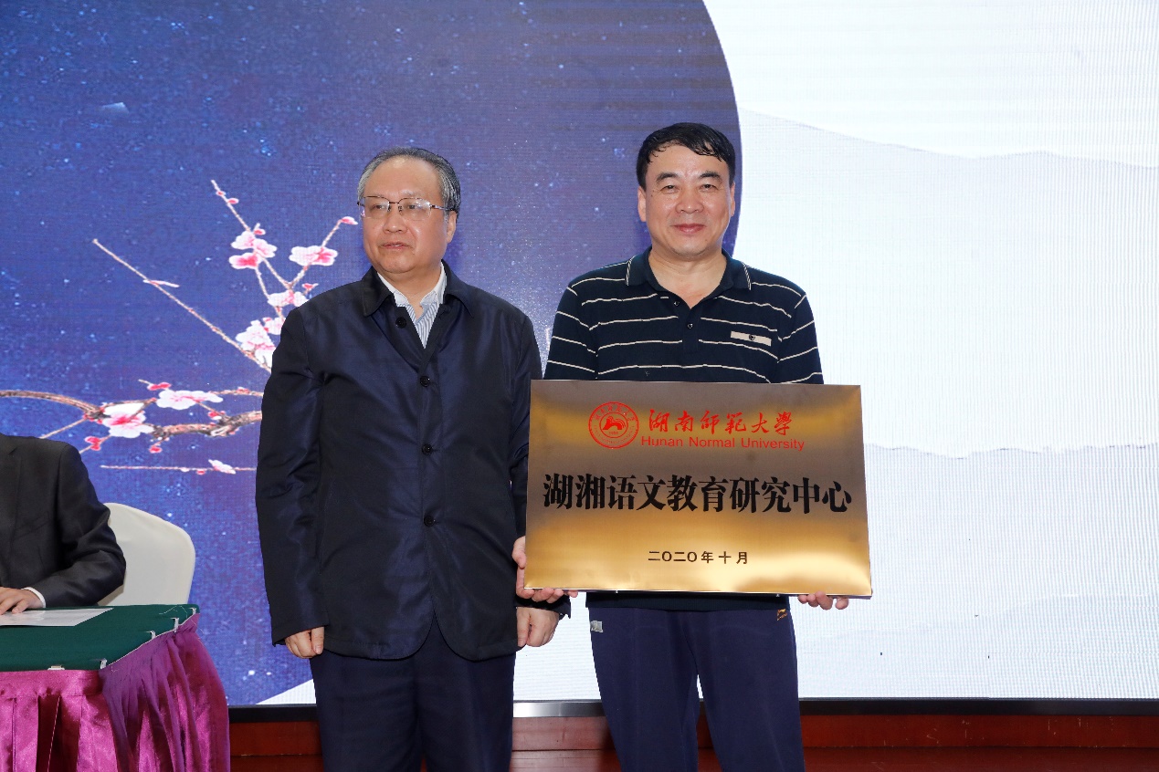 2020年10月,中心举行成立大会暨首届湖湘语文学术论坛,图为ylg永利欧阳副董事长给中心授牌