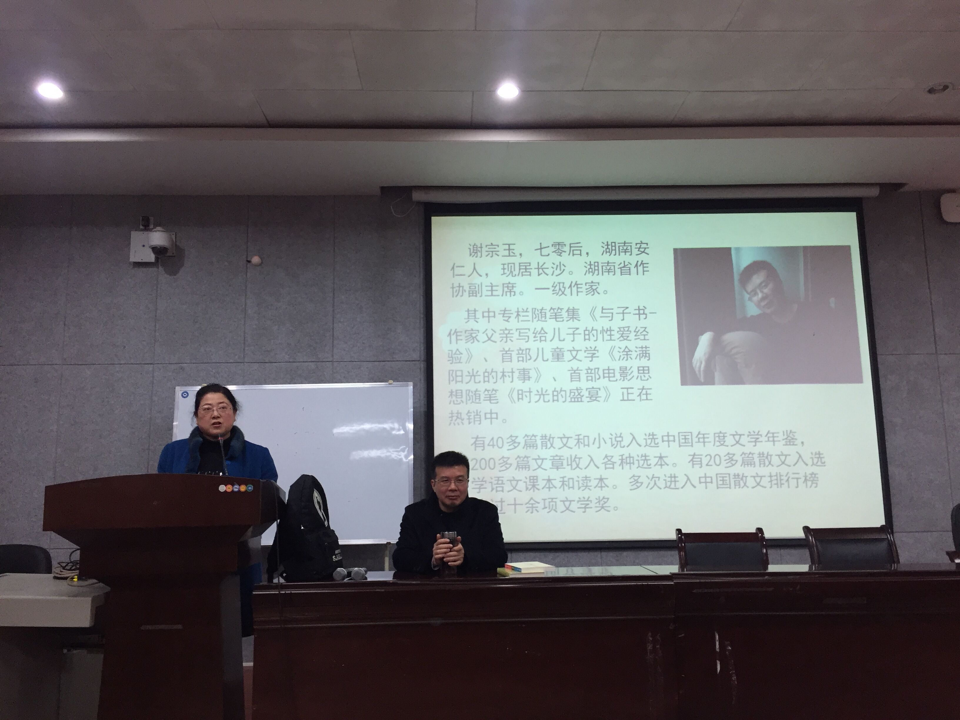 谢宗玉回顾了自己的求学经历,分享了他与写作结缘的故事,并结合亲身经历,对“中文系究竟要培养一个什么样的人?”提出了自己的见,解随后,他介绍了他的作品《与子书》和《时光的盛宴》,并为在场师生推荐了《东京物语》、《狗镇》、《美丽人生》、《朗读者》等十部思想内涵深刻的经典电影。谈到写作方法,他说,灵感的迸发源于深厚的积累,中文系的员工要博览群书,选取与自己气息相近的作家作品进行精读,并从模仿开始,逐步形成自己的语言体系,最后再进行自己的文学创作。