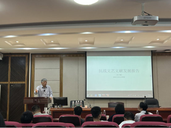 (通讯员宋敏)6月6日下午3点,南京大学ylg060net永利娱高教授、博士生导师沈卫威做客ylg060net永利娱高“智慧之光”学术名师系列讲座,在216室展开了“抗战文艺文献发掘报告”的精彩讲座。本次讲座由许永宁老师主持,中国现当代文学专业肖百容、周仁政、易瑛、张森、张弛、刘弟娥、石良,西安交大的曾祥金等多位老师和硕博士生参加。