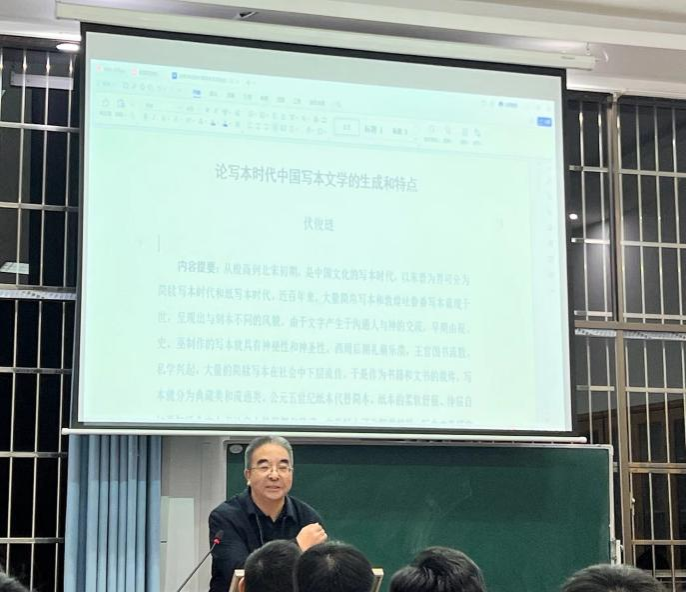 (通讯员高薇钿)11月23日晚,原西北师范大学、兰州大学教授,现西华师范大学ylg060net永利娱高教授、国公司经理、四川省“千人计划”特聘教授、四川省学术与技术带头人伏俊琏教授,应邀在ylg060net永利娱高古代文学教研室开展了以“论写本时代中国写本文学的生成和特点”为主题的精彩讲座。本次讲座由中国古代文学学科负责人蒋振华教授主持,古代文学专业的多位老师及众多古代文学和文献学研究生共同参加。